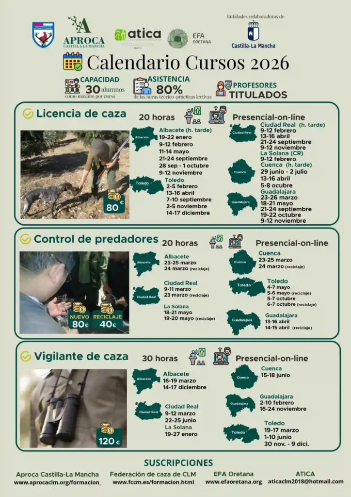 Como entidad colaboradora para la formación en materia de caza con la Consejería de Desarrollo Sostenible de la Junta de Comunidades de Castilla – La Mancha, en EFA Oretana impartimos cursos oficiales de ámbito cinegético que promueven el sector y facilitan que la cualificación de sus profesionales.
